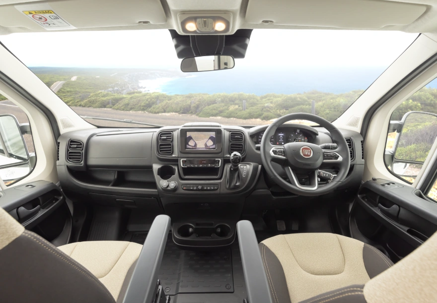 It’s easy to access the amenities from the driver’s cabin, and the daytime living area feels spacious and homely, thanks to soft seating and plenty of light.