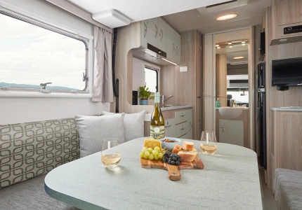 Royale is the ultimate large-family or group travel solution, with a slide-out queen bed, two further double beds, and a dedicated dining and lounge space.